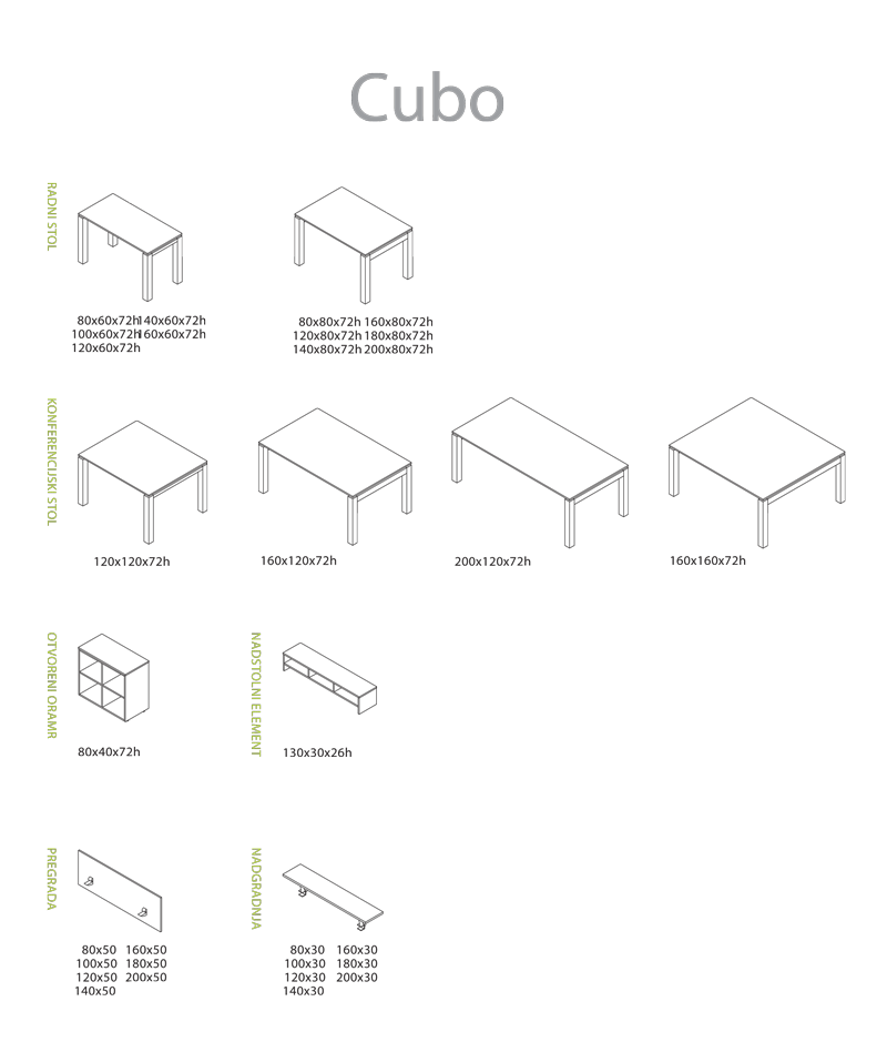Program uredskog namještaja Cubo svojom jednostavnošću daje radnom prostoru dojam lakoće i prozračnosti. S njime je vrlo jednostavno preuređivanje radnog prostora. Program Cubo karakterizira čistoća linija, funkcionalnost i praktičnost, posebice u vrijeme uvođenja računalnih ‘ravnih ekrana’ koji povećavaju iskoristivost radnih površina. Boje, od neutralne bijele do dinamične antracit, u kombinaciji s metalnim dijelovima namještaja, stvaraju bezvremensku ambijentalnu liniju programa Cubo.