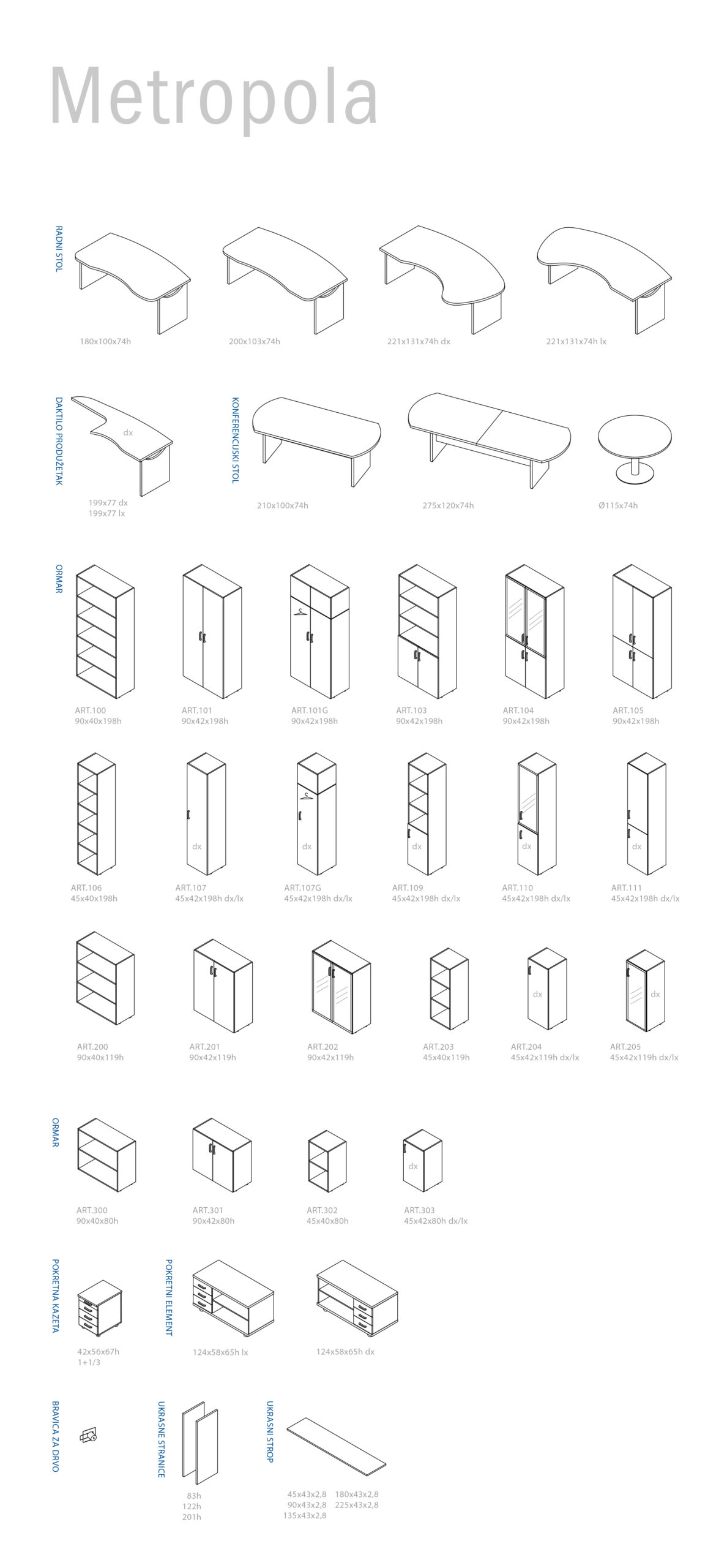 Svaki detalj programa Metropola pažljivo je dizajniran kako bi ispunio estetske i funkcionalne zahtjeve variranjem elemenata za organizaciju radnih mjesta različitih oblika. Nadasve zanimljivi oblici cijele kolekcije variraju između klasičnog stila i modernog dizajna u svjetlom javoru, elegantnom calvadosu ili pak u crnosmeđem hrastu.