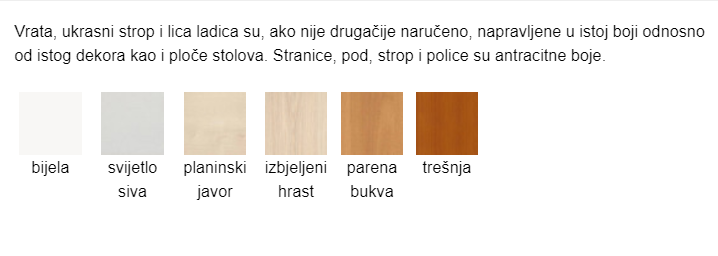 U boji namještaja izrađuje se gornja ploča kazete i lica ladica (iveral 18 mm). Ostali drveni dijelovi su također od iverala debljine 18 mm, u pravlu antracitne boje. Svi rubovi obrađeni su ABS trakom. Leđa kazete postavljena su u utore, a izrađena su od iverala debljine 8 mm također u antracitnoj boji.