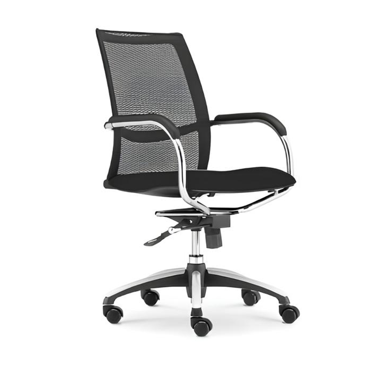 Uredski stolac sa sjedalom od crne kože, mrežastim naslonom i kromiranim rukonaslonima presvučenim PVC-om.