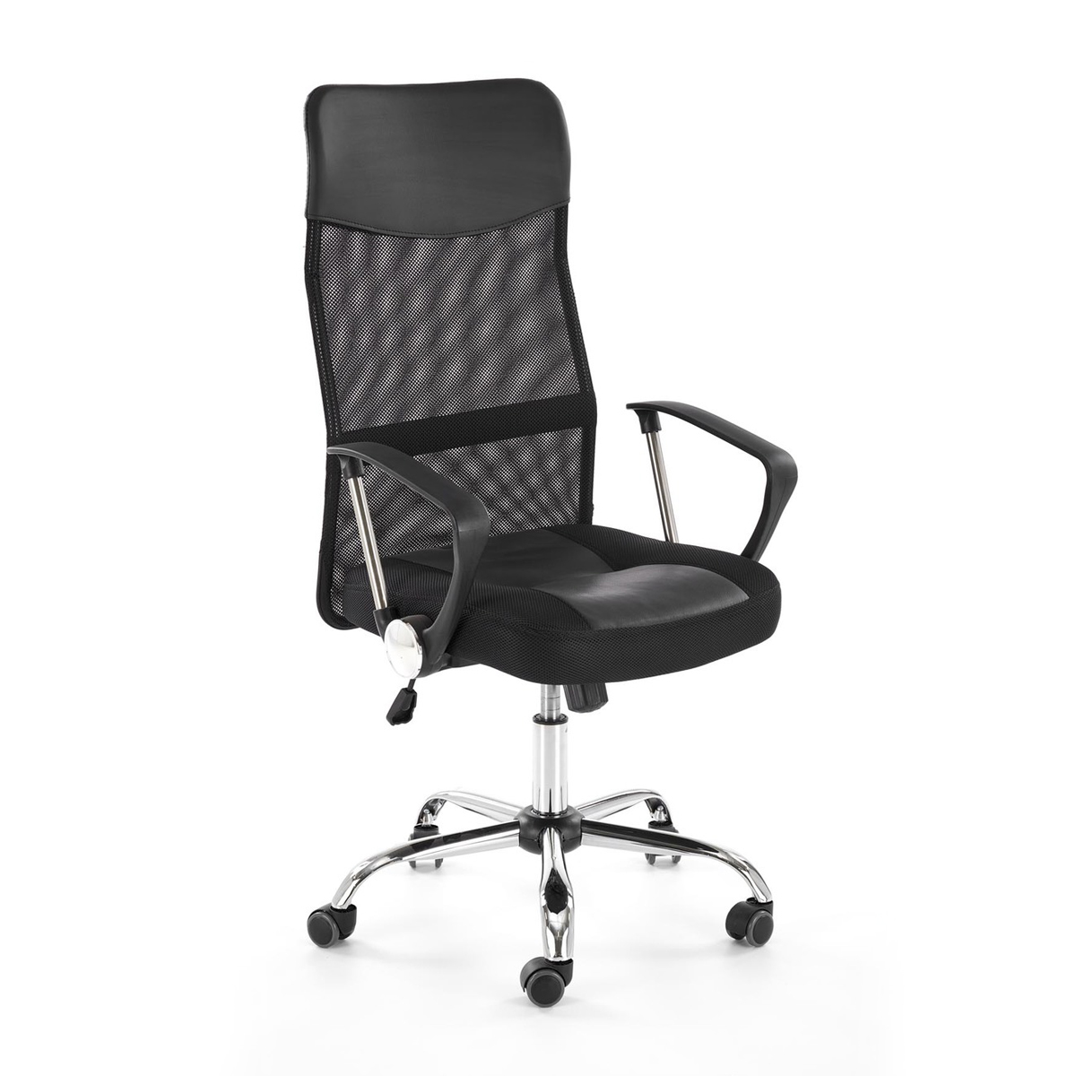 Visoki uredski uredski stolac s fiksnim rukonaslonima, i naslonom za leđa u poliuretanskoj mreži (na metalnom okviru).